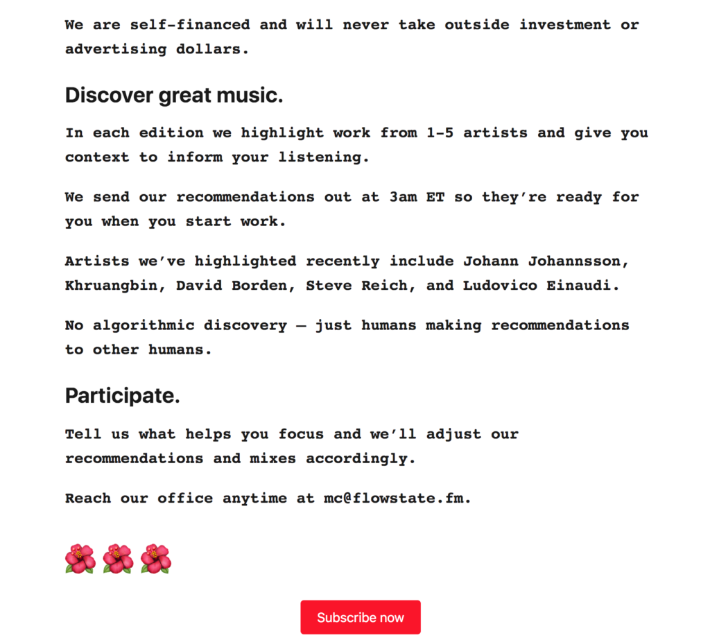 Subscribe to Flow State for a daily curated music playlist made to help you work.